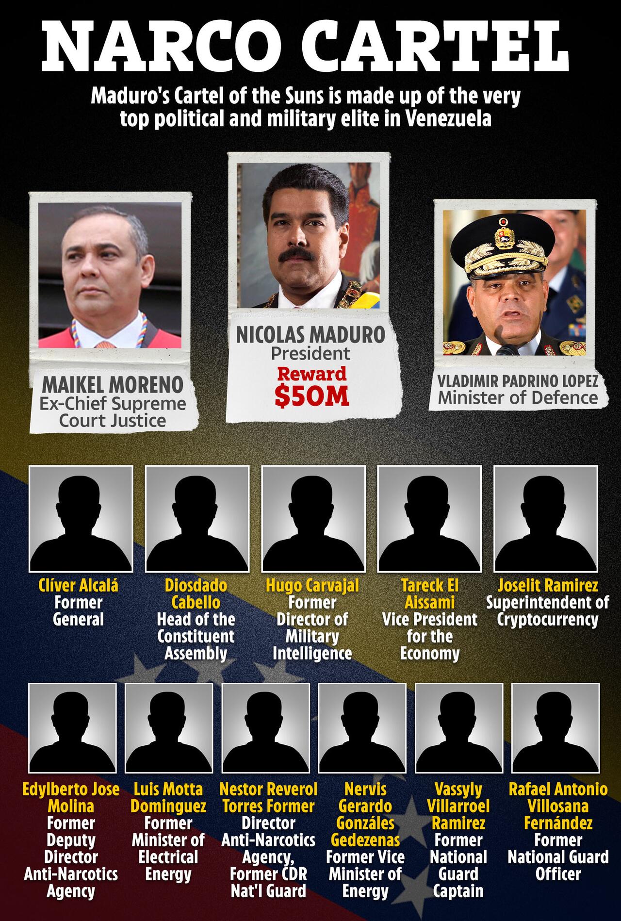 "Con sede en Venezuela, el Cártel de los Soles está encabezado por Nicolás Maduro y otros individuos de alto rango del régimen ilegítimo de Maduro que han corrompido el ejército, la inteligencia, la legislatura y el poder judicial de Venezuela", señala el comunicado oficial estadounidense. "Ni Maduro ni sus compinches representan al gobierno legítimo de Venezuela"